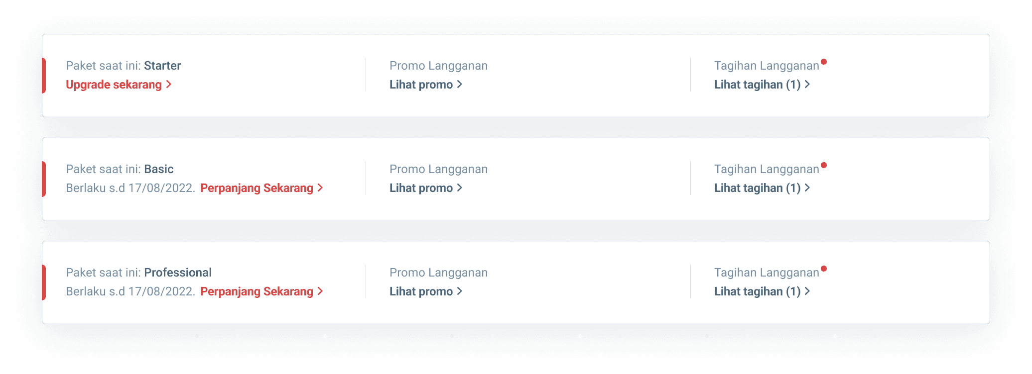 Membership status and expiration date are shown on the "Tagihan dan Paket" page. Renew with "Perpanjang Paket" if 7 days left. "Upgrade Sekarang" for non-subscribers. Check promotions and view bills.