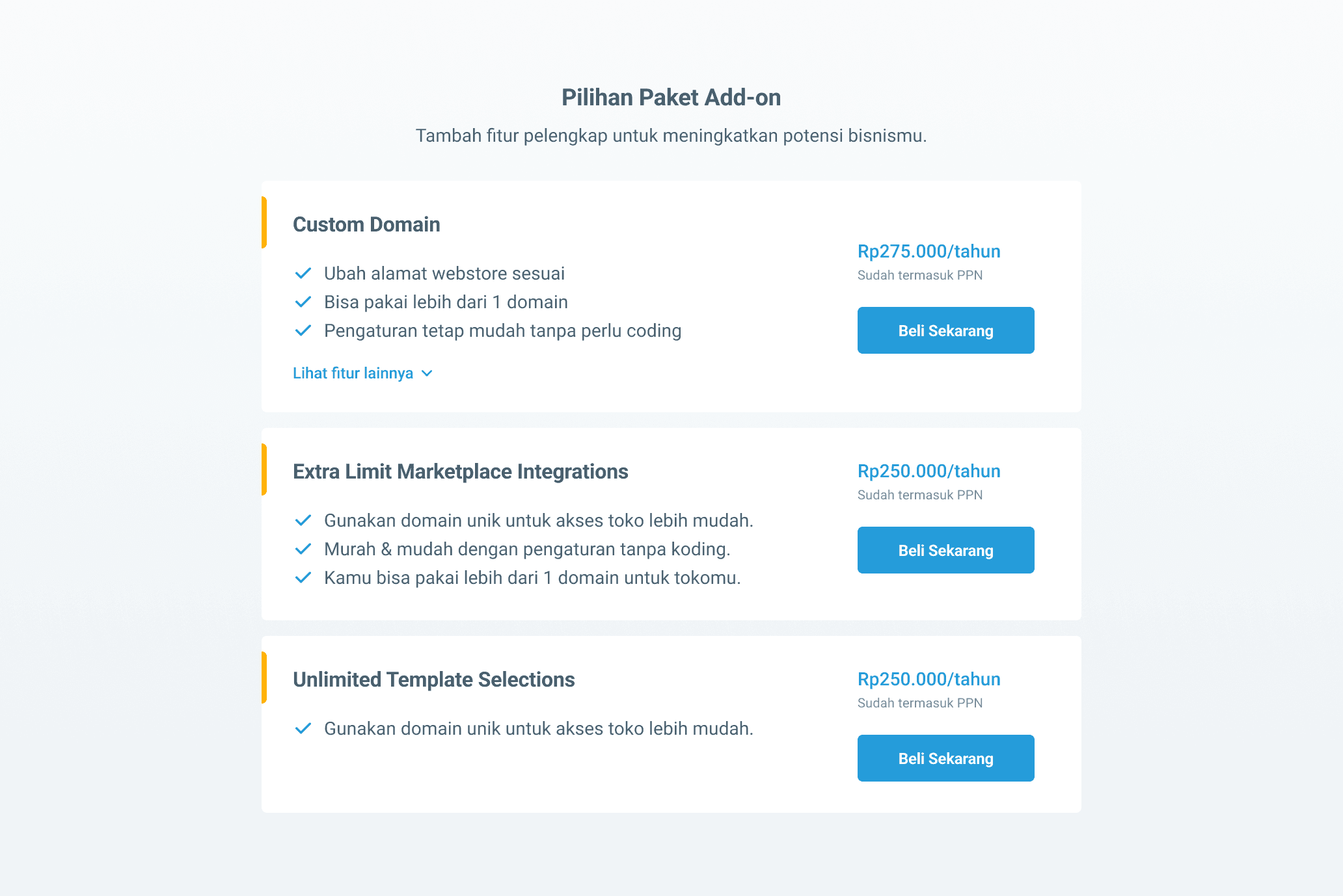 'Add On' Menu: It's your one-stop shop for packages and add-ons. Choose from different subscription packages with cool benefits, or grab extra features/products like custom domains without subscribing to a package.